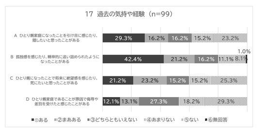 一方で、利用者の生活実態調査を実施したところ、「ひとり親になって将来に絶望したり、死にたいと思ったことがある」との設問に、「ある」「まあある」と回答された方が4割を超えるなど、厳しい実態が明らかになりました。