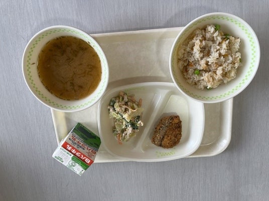 今年度は新たに中学生も対象として、このたび、鳥取市立青谷小学校(左下写真)および青谷中学校(右下写真)の全学年児童および生徒を対象として、漁業者が県内で蓄養したウニを使った「藻場の恵みご飯(ウニ・サザエの炊き込み)・アカモク汁(味噌汁)」の給食を提供することで、身近な海の抱える課題について広く考えていただく機会としました。