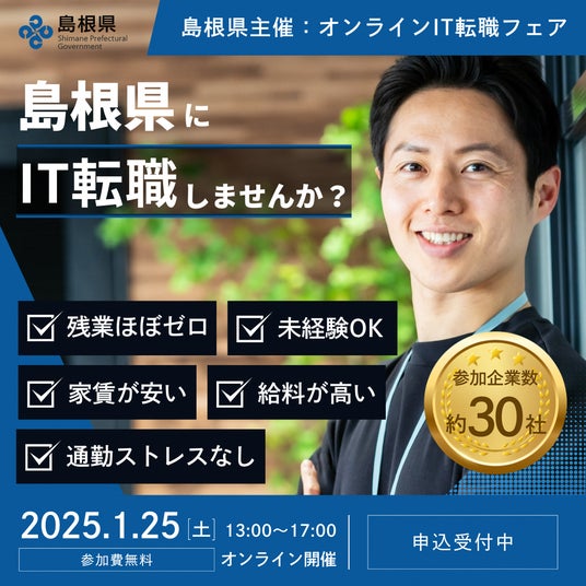 島根県が運営するITに特化した無料職業紹介制度「IT WORKS@島根」では、島根県内のIT企業が集結する「GO島根!ITエンジニア転職フェア」を令和7年1月25日(土)に開催します。