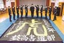 部員8人が参加し蛇の形を表す象形文字と、赤い墨で大きく「巳」と大筆で書いた。部員らで考えたという「元気な一年 そう蛇(じゃ)そう蛇(じゃ)」との文を添え、新年の健康を願う思いを込めた。公民館で27日から展示する。