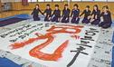 益田市七尾町、益田高校の書道部が17日、同市高津2丁目の高津公民館で、巨大な筆を使って縦3・4メートル、横3・7メートルの和紙に2025年の干支(えと)「巳」の文字を揮毫(きごう)した。
