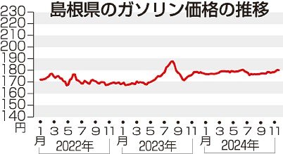 経産省によると、島根県の16日時点の小売価格は180円。ガソリンスタンド業者でつくる県石油協同組合(松江市西嫁島3丁目)の聞き取りによると、仕入価格の上昇を受け、多くの組合員が12月中に5円程度の値上げに踏み切るとみられるという。森山康史専務理事は「利益を増やすための値上げでないのは理解してほしい」と訴える。