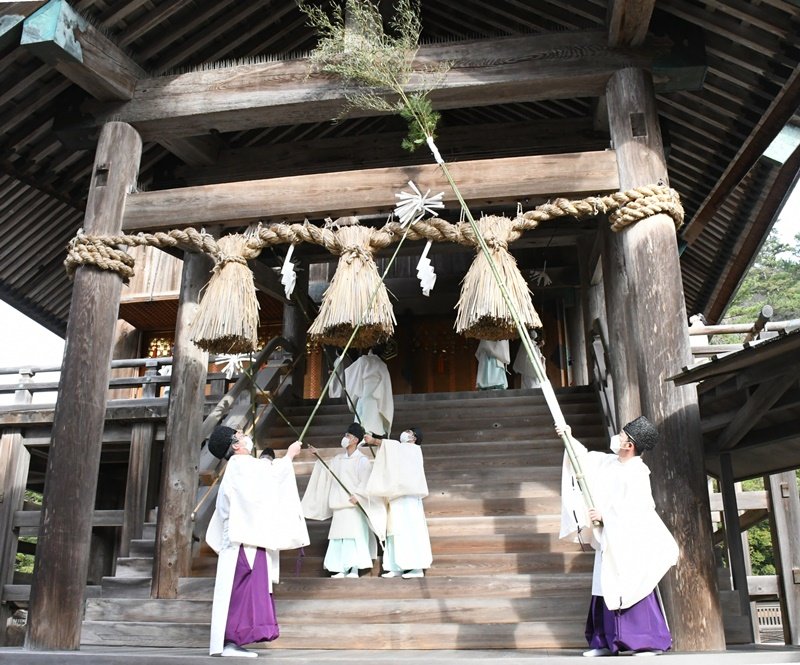 出雲大社(出雲市大社町杵築東)で20日、歳末恒例の「御煤払(おすすはらい)」があった。国宝の本殿で神職が大笹やはたきを振るい、天井や梁(はり)、軒下などにたまった1年間のほこりを払い落とした。