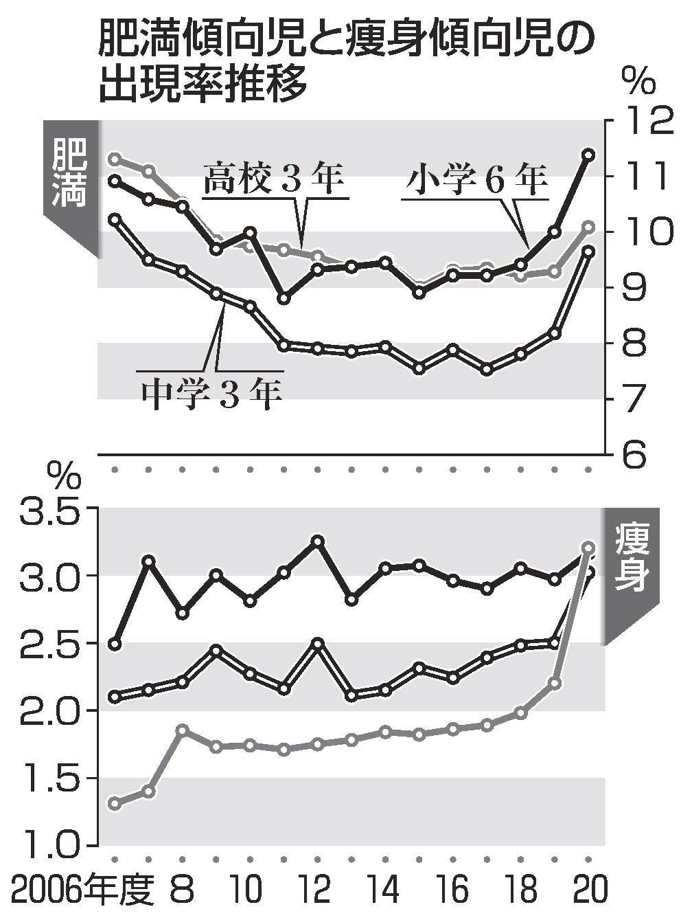 調査は全国の幼稚園と小中高校の健康診断結果を一部抽出して集計。例年は4~6月に実施する健診を基に集計するが、20年度は新型コロナウイルスの感染拡大に伴う一斉休校で健診時期が遅れた学校が多く、文科省は前年度との単純比較は難しいとしている。ただ、肥満と痩せすぎが増えたことに担当者は「生活習慣の変化や運動不足が影響した可能性がある」と分析した。