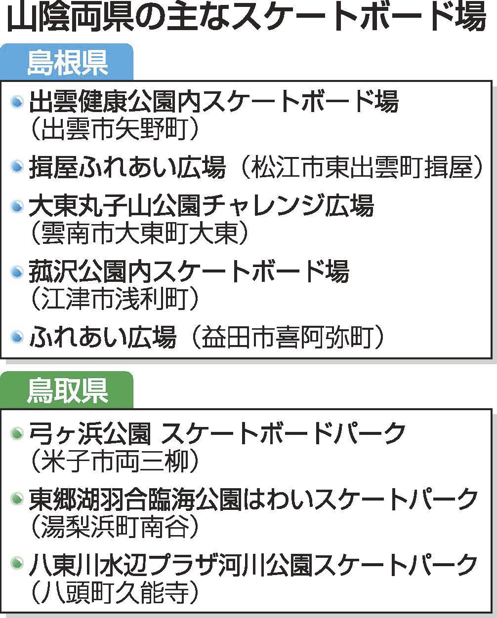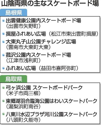 北村事務局長や岡崎代表によると、両県で主なスケートボード場は、金メダリスト西矢椛(もみじ)選手も訪れたという出雲健康公園内スケートボード場(出雲市)、東郷湖羽合臨海公園はわいスケートパーク(鳥取県湯梨浜町)など8カ所ほどと、少ない。