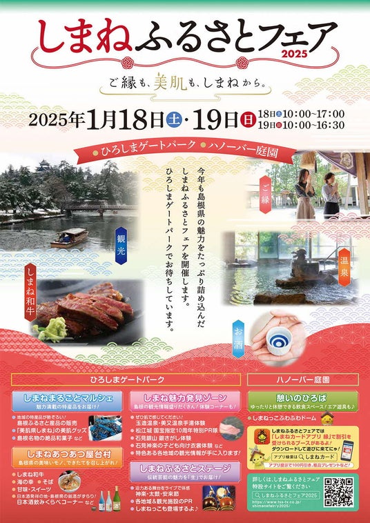 島根県と県内市町村等で組織する広島地区観光情報発信事業実行委員会(会長:島根県知事 丸山達也)では、広島県からの交流人口の拡大及び観光客の誘致を図ることを目的に、ひろしまゲートパークプラザ周辺にて「しまねふるさとフェア」を開催します。