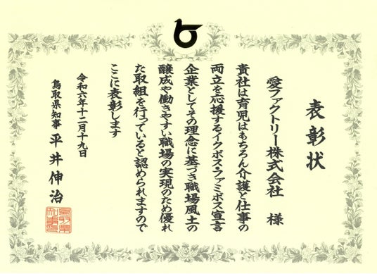 株式会社IDホールディングス(本社:東京都千代田区、代表取締役社長 舩越 真樹 以下、当社) の特例子会社である愛ファクトリー株式会社(以下、愛ファクトリー)は、「令和6年度イクボス・ファミボス宣言優良企業」に選出され、このたび、鳥取県知事より表彰を受けました。