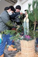 9人が直径20センチ、高さ3メートルのモウソウダケや高さ2・5メートルの松を土の入ったたるに設置し、紅白の葉ボタンや南天、梅で飾り付けた。