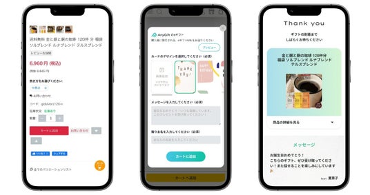 AnyGiftは、相手の住所を知らなくてもLINEやメールで贈ることができる"eギフト機能"を、ECサイトに組み込むことができるサービスです。