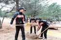 児童は津和野駅で展示されているSL(D51)の周囲に散らばっていた小石の掃き掃除や草取りをし、ベンチを丁寧に拭いた。