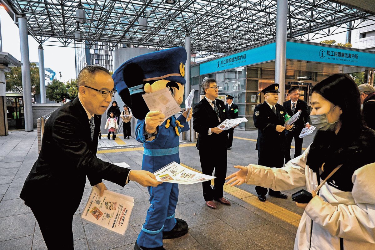 朝の通勤時間帯に山陰合同銀行と島根銀行、島根県警の計20人が街頭に立ち「特殊詐欺にご注意ください」と、通行人に声をかけながらチラシ計300枚を手渡した。