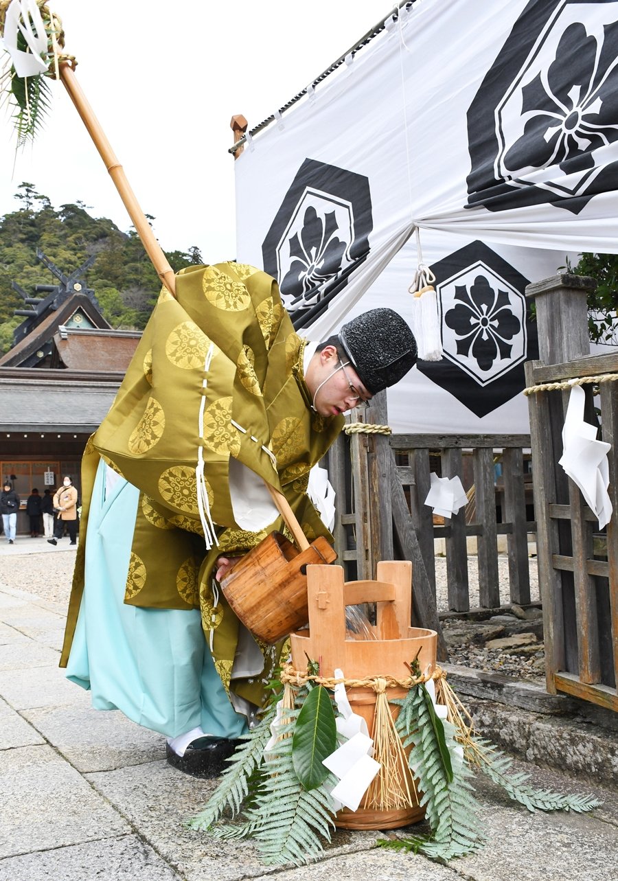 出雲大社(出雲市大社町杵築東)で27日、若水をくむ神事「御饌井(みけい)祭」が営まれた。神職7人が拝殿西隣の井戸・御饌井を清めた後、神前に供える水がひしゃくでくみ上げられた。新年最初の神事「大御饌(おおみけ)祭」で供えられる。