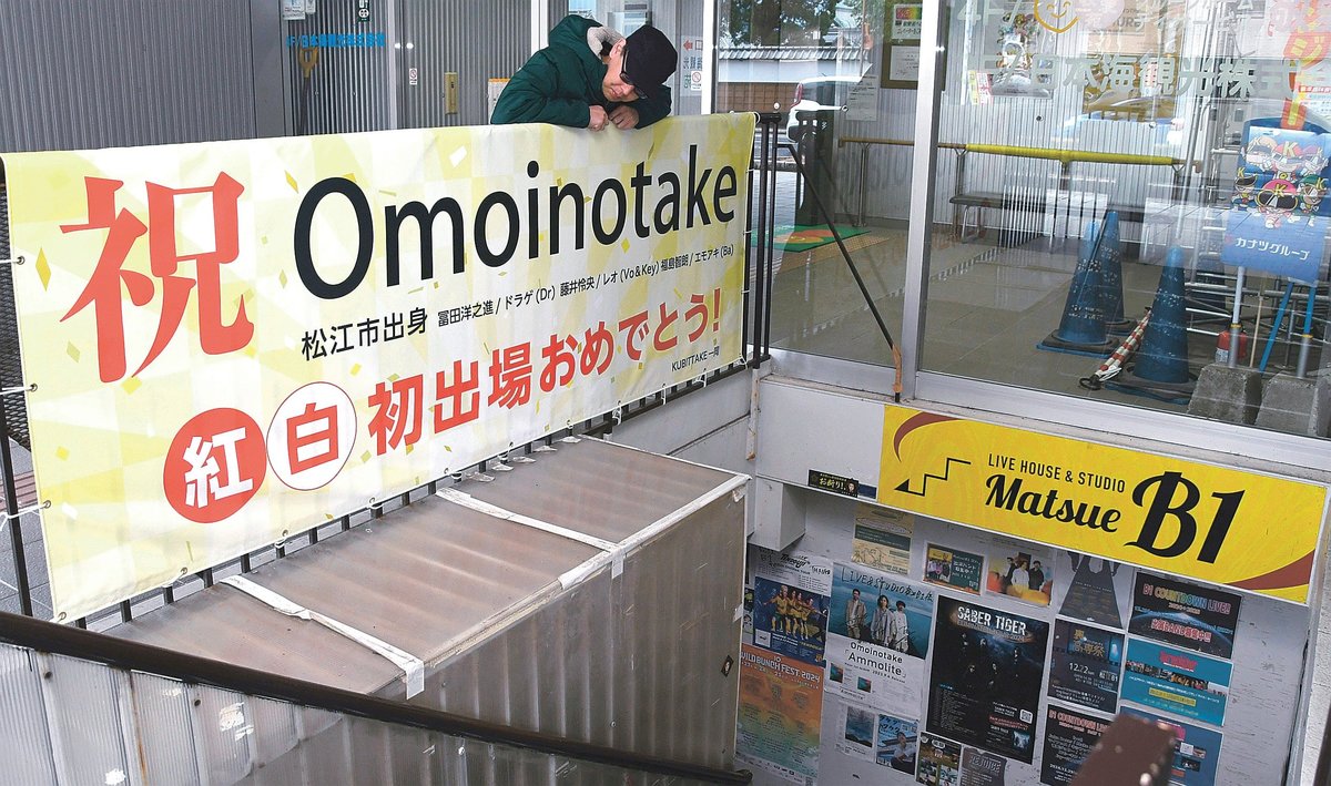 松江市出身のピアノトリオバンド・Omoinotake(オモイノタケ)が、大みそかのNHK紅白歌合戦に初出場するのを祝福し、横断幕がメンバーゆかりのライブハウス「松江B1」(松江市寺町)などに掲げられている。島根県内のファン有志が中心となり、交流サイト(SNS)で協力を募って制作し、喜びを幕に込めた。