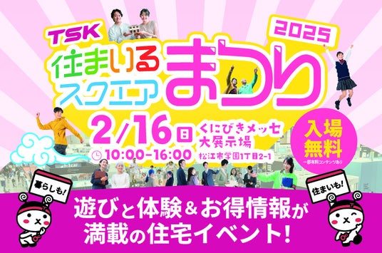 TSKさんいん中央テレビは、2025年2月16日(日)、松江市の「くにびきメッセ大展示場」にて、暮らしと住まいに関する大規模イベント「TSK住まいるスクエアまつり2025」を初開催いたします。