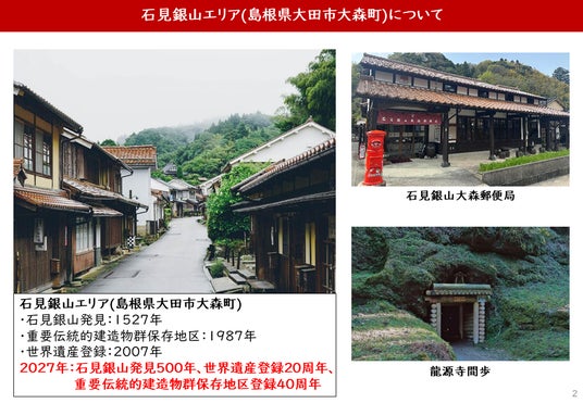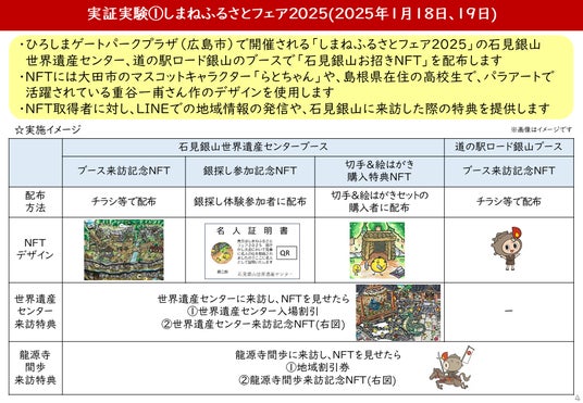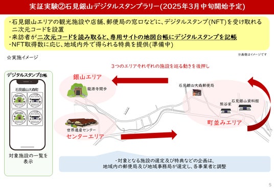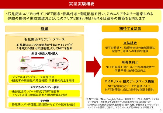 一般社団法人石見銀山みらいコンソーシアム(島根県大田市、代表理事:松場 大吉、以下「みらいコンソ」)、日本郵政株式会社(東京都千代田区、取締役兼代表執行役社長 増田 寬也/以下「日本郵政」)、日本郵便株式会社(東京都千代田区、代表取締役社長兼執行役員社長 千田 哲也/以下「日本郵便」)および大田市(市長 楫野 弘和)は、石見銀山エリア(島根県大田市大森町)において、NFT※を活用した観光体験の向上や来訪誘致、地域と関わり続けられる仕組みの構築に向けた実証実験を行います。
