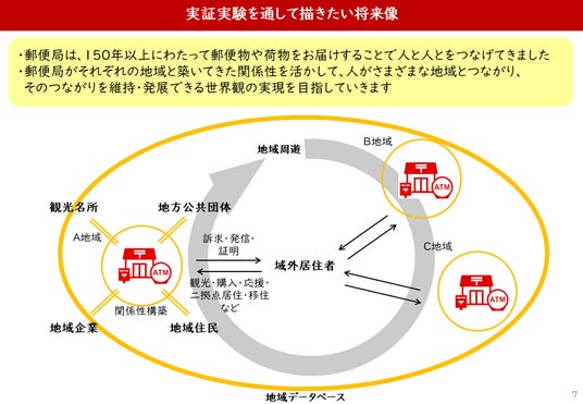 および地域事業者と連携したサービス提供の実証実験や、日本郵政グループの各事業と連動した取り組み、郵便局が関係性を築いている他地域への展開も検討します。