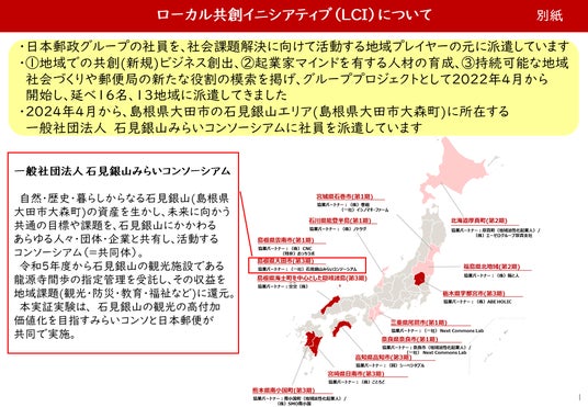 日本郵政グループでは、社会課題に取り組む企業や地方自治体などに社員を派遣し、共同で新規事業創出に取り組む「ローカル共創イニシアティブ」施策の一環で、石見銀山エリアに所在するみらいコンソに2024年4月1日から社員を派遣しています。