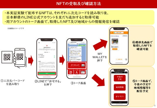 ※ 読み取り後、日本郵便が運営する地域情報等を発信するLINE公式の画面に遷移します。友だち追加後、NFTを受け取ることが可能です。当該NFT受取にはLINEアカウントが必要になるため、ご留意ください。