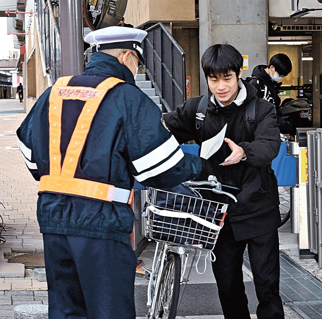 同署はJR松江駅西駐輪場(松江市朝日町)で高校生らにヘルメット着用などを求めるチラシを手渡した。
