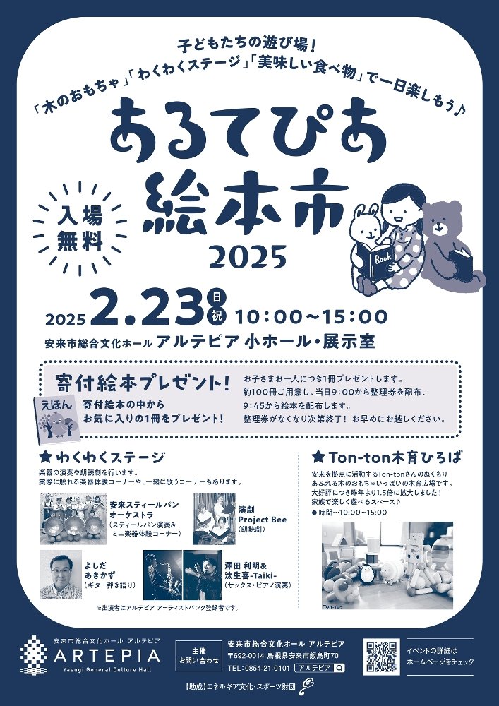 絵本の無料プレゼントやステージイベントなどが楽しめる「あるてぴあ絵本市」が、2月23日午前10時から午後3時、安来市飯島町の総合文化ホールアルテピアである。入場無料。