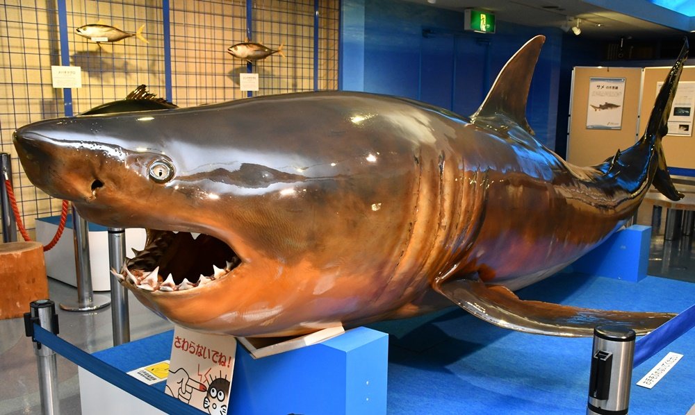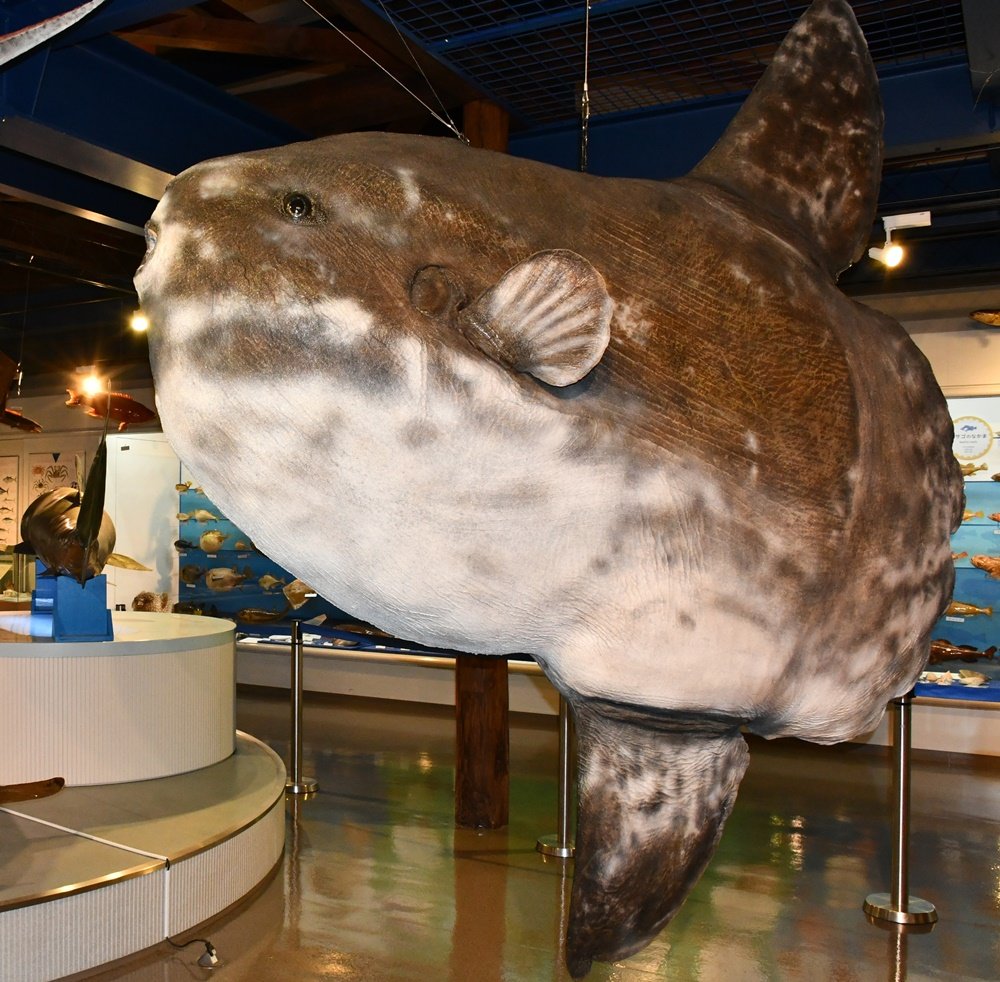 出迎えてくれるのは体長約4メートルのホホジロザメ。大きな口に鋭い歯がのぞき、「海のギャング」の迫力を伝える。次に目を引くのは同約2・8メートルのマンボウ。剥製としては日本一のサイズで、捕獲されたのは大田市温泉津町沖。身近な海を大物が泳いでいたことに驚かされる。