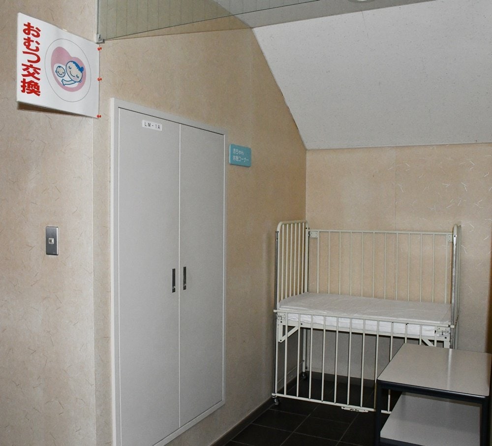 おむつ交換台は1階廊下の赤ちゃん休憩コーナーにある。
