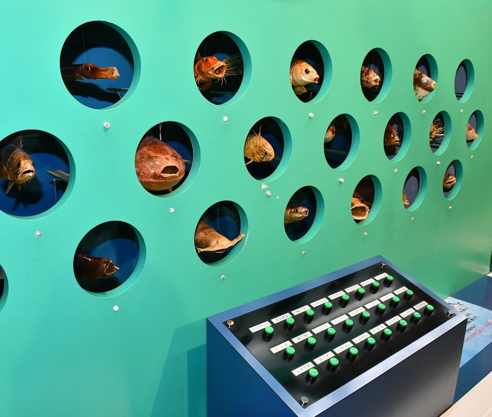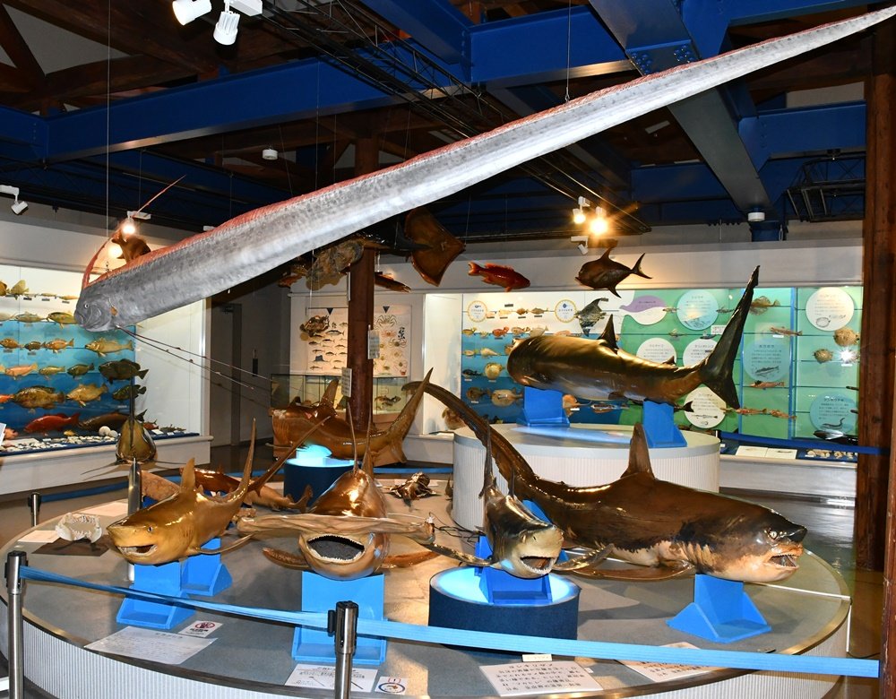 深海魚・リュウグウノツカイやシュモクザメ、さまざまな種類のカニなど、多様な剥製がぎっしり並ぶ。剥製の顔を見て、海の生き物の種類を当てるクイズがユニーク。泳ぐ魚の顔を正面からじっくり見ることは難しく、この施設ならではの楽しみ方だ。