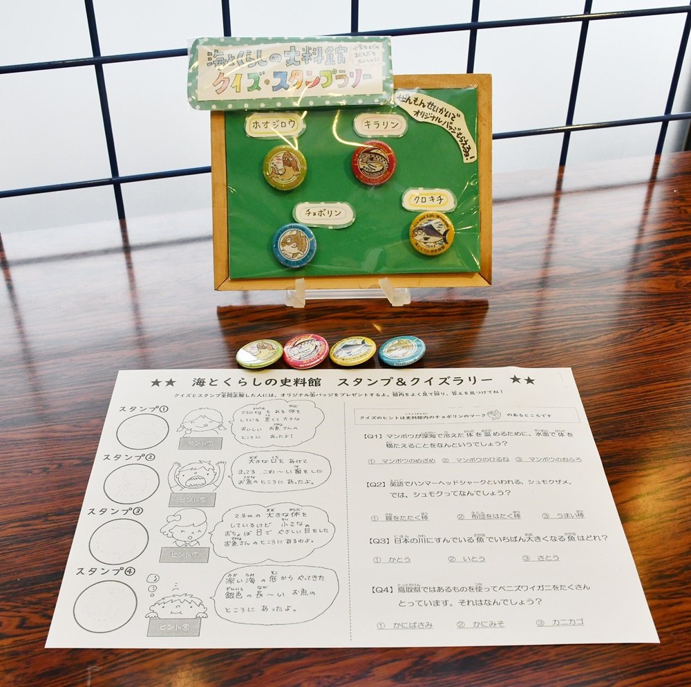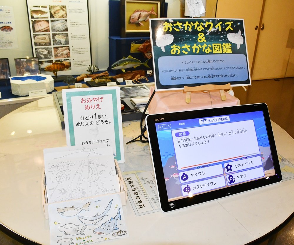 魚の図鑑やクイズをタッチパネルで楽しめるコーナーもあり、遊びながら詳しくなれる。土日、祝日限定でクイズラリーも開催している。挑戦してオリジナル缶バッジをもらおう。民具や季節ごとの展示もある。
