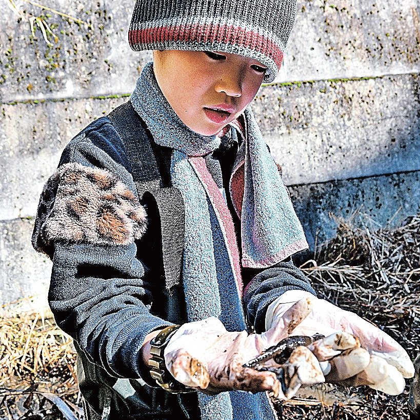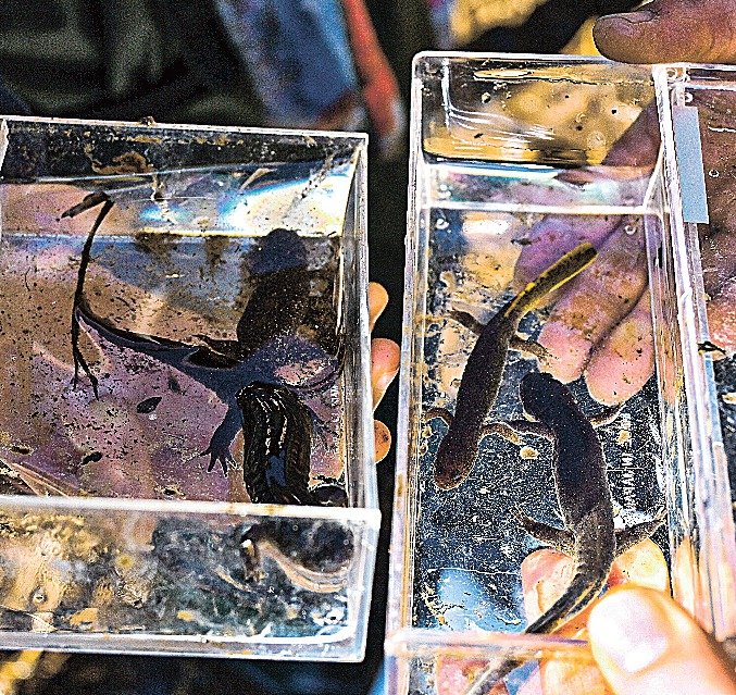 3匹のサンインサンショウウオを見つけた西伯小3年の足羽穂高さん(9)は「いつもたも網ですくってもほとんどいないから、今日は3匹も見つけられてうれしい」と笑顔で話した。
