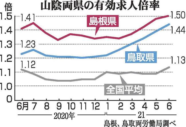 島根、鳥取両労働局が30日公表した6月の有効求人倍率(季節調整値)は、島根が前月比0・02ポイント上昇の1・50倍、鳥取が0・05ポイント上昇の1・44倍だった。上昇は島根が4カ月連続、鳥取が7カ月連続。再拡大する新型コロナウイルスの影響を引き続き注視する必要があるとして雇用判断は据え置いた。