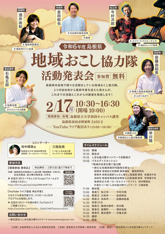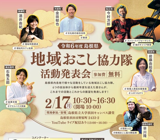 本イベントは公益財団法人ふるさと島根定住財団が主催し、本学西嶋一泰研究室が共催、島根県の地域おこし協力隊OBOGが組織した一般社団法人しまね協力隊ネットワークが運営します。
