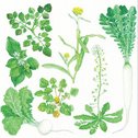 遙堪コミセンの講座「郷土の自然と植物ウオッチング」と同校の融合学習として毎年開催。6年生約25人が講座の会員の畑で七草を採取し、コミセンでは事前に調べた正月料理などを発表した。