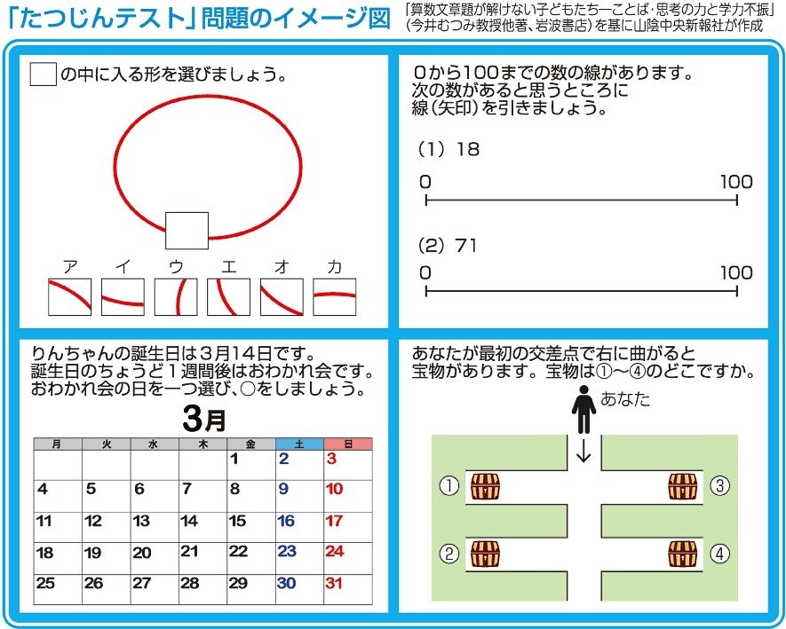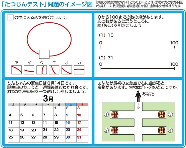 「かず・かたち・かんがえるたつじん」は数や量についての正しいスキーマを持っているか▽図形をイメージし頭の中で回転させたり折り畳んだり展開したりできるか▽論理的な推論ができるか-などを測る。