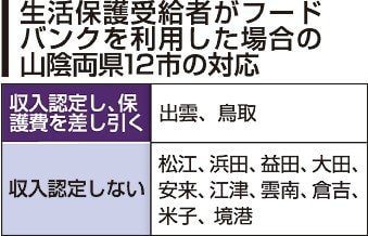 約800世帯の受給者がいる出雲市は、事前にフードバンクを利用しないように指導。利用を把握した場合や受給者から利用の申し出があった場合は翌月以降、保護費から差し引いている。市福祉推進課の常松博雄課長は「保護費の中に食費が入っており、その中でやりくりしてもらう必要がある。常態化すれば保護を受ける他の人との不公平が生じる」と話した。