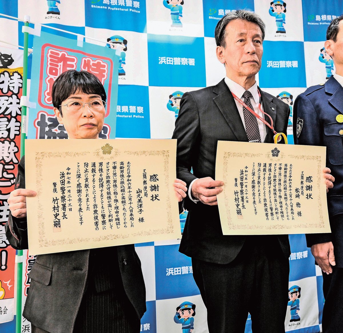 おれおれ詐欺を未然に防いだとして、浜田市三隅町向野田の三隅郵便局の山元美津子さん(64)と、松崎稔局長(63)にこのほど、浜田署から感謝状が贈られた。