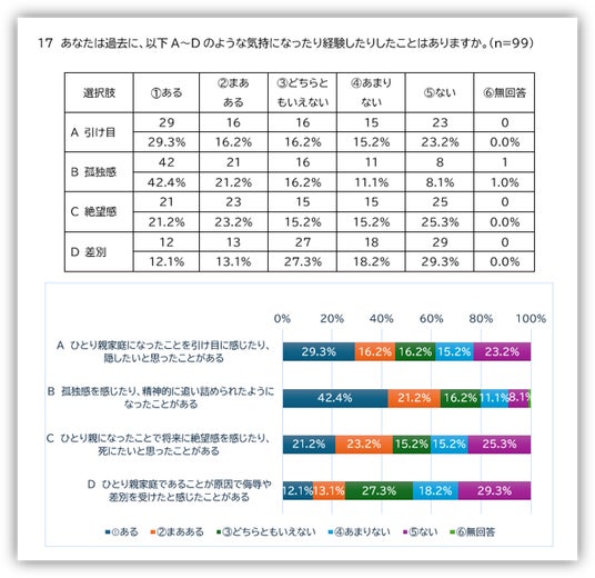 一例をあげます。「ひとり親になって将来に絶望したり、死にたいと思ったことがある(か?)」との問いに、「ある」「まあある」と回答された方は…。なんと4割を超えています。一層の支援が急務と考えます。