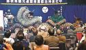 伝統芸能・石見神楽の夜間定期公演が1日、松江市玉湯町玉造の日帰り温泉施設「玉造温泉ゆ~ゆ」であった。江津市内の人気社中が石見神楽の代表的な2演目を披露し、約100人の来場者が温泉街に響く軽快な囃子(はやし)と勇壮な舞を楽しんだ。
