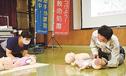 松江市消防本部の職員が乳幼児の人形を使用し、心肺蘇生法や自動体外式除細動器(AED)の使用方法などを説明した。子どもとともに参加した松江市上乃木9丁目の新井祐子さん(34)は「一緒に参加できる機会は少ない。いざという時に動けるようにしたい」と振り返った。