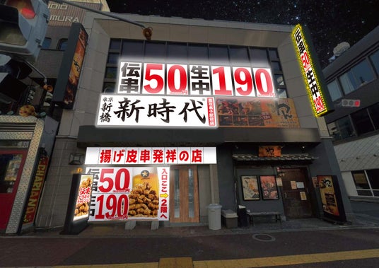 新時代は「揚げ皮串発祥」のお店であり、名物の『伝串』は、特許庁から認められる唯一無二の大ヒット商品です。並んででも「伝串」を体験されたいというお客様が多く、連日行列ができる大人気の居酒屋です。1000の街を元気にするため、全国の街を一つずつ元気にしており、今回はついに山陰地方初上陸。鳥取・米子から山陰地方だけでなく関西全体を元気にします。オープン前から大行列ができること間違いなしです。