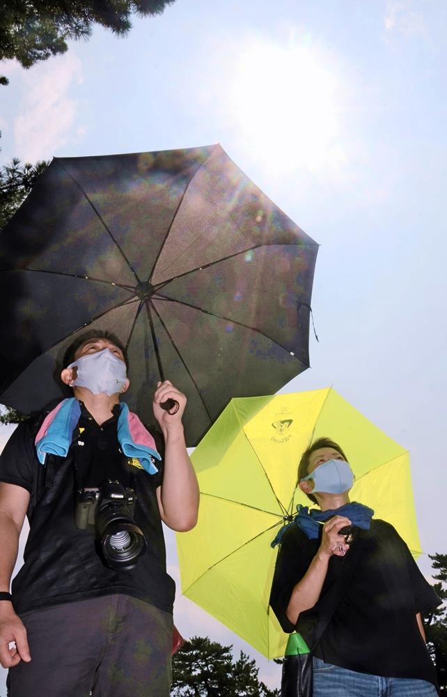 夫婦で松江城に観光で訪れたという名古屋市の会社員大野木康晴さん(49)は「朝、米子から観光しているが、ずっと暑い。倒れそう」と日傘を差し、汗を拭った。