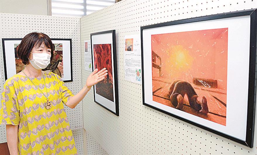 原爆の閃光(せんこう)と爆風に身を伏せる人、顔が分からないほど皮膚が焼けただれた友人、ぐったりとしたわが子を背負いながら助けを求める血まみれの母親など、胸を打つ力作が並ぶ。被爆者の写真や核兵器に関する資料も展示した。