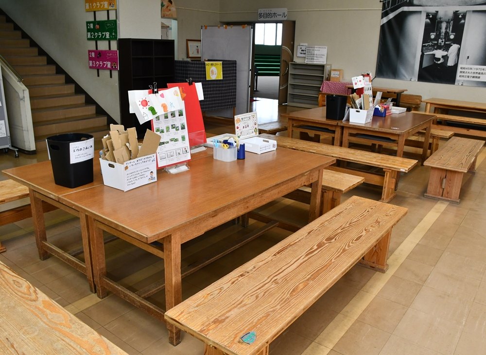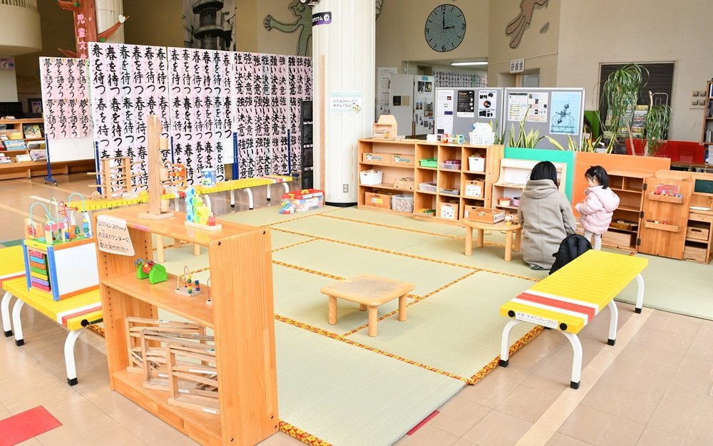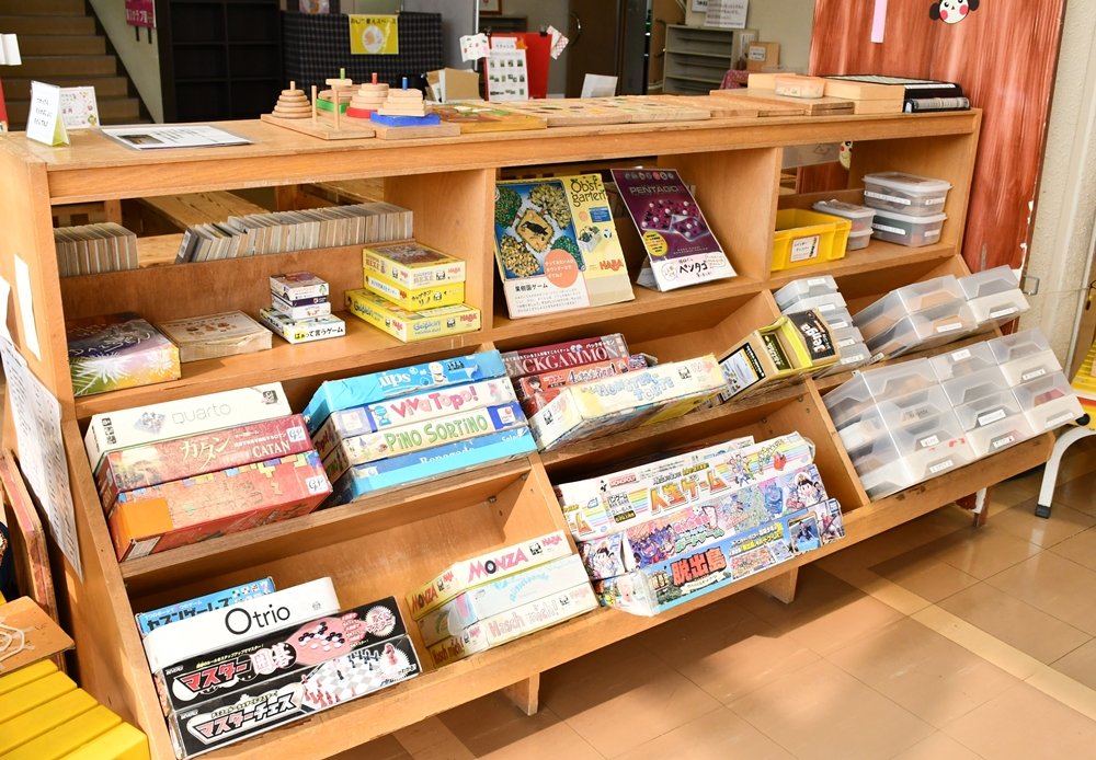 ホワイエはいろいろな遊びが充実。段ボールや空き箱の切れ端を自由に使った工作体験、けん玉などの昔遊びコーナーがある。「人生ゲーム」といったボードゲームやパズル、「名探偵コナン」などのマンガもあり、1人でも大勢でも楽しめる。木製おもちゃやままごとセットがある畳のスペースは乳幼児にお勧めだ。