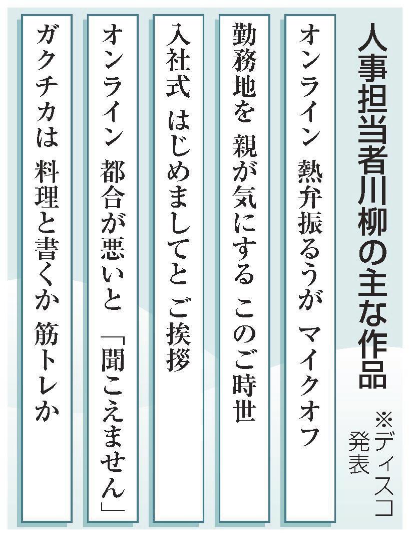 「オンライン 熱弁振るうが マイクオフ」「勤務地を 親が気にする このご時世」。就活情報会社ディスコ(東京)が、新卒採用に当たる人事担当者から募集した川柳を発表、新型コロナウイルス禍で苦心する様子が浮かび上がった。