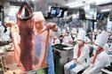 浜田市殿町の夕日ケ丘聖母幼稚園で15日、特大アンコウの解体ショーがあり、アンコウが食...