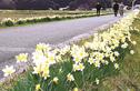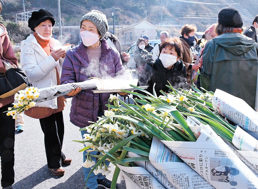 島根県隠岐の島町油井の油井漁港で16日、「油井すいせん祭り」が開かれた。来場者にスイセンの花束がプレゼントされたほか、地元特産のハッサクや海産物が安価で販売されてにぎわった。
