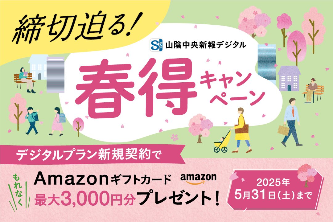 山陰中央新報の記事がスマートフォンやパソコンで読める「山陰中央新報デジタル」は、2025年3月1日(土)から5月31日(土)まで「春得キャンペーン」を実施します。デジタルプランの新規ご契約(6ヵ月以上の継続)で最大3,000円分のAmazonギフトカードをプレゼントします!