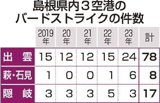 出雲空港(出雲市斐川町沖洲)で鳥が航空機に衝突する「バードストライク」の衝突率が2023年、全国で最も高かったことが分かった。11年以来で、詳しい理由は明らかになっていない。県は従来のパトロールに加え、夜間の監視態勢を強化する。