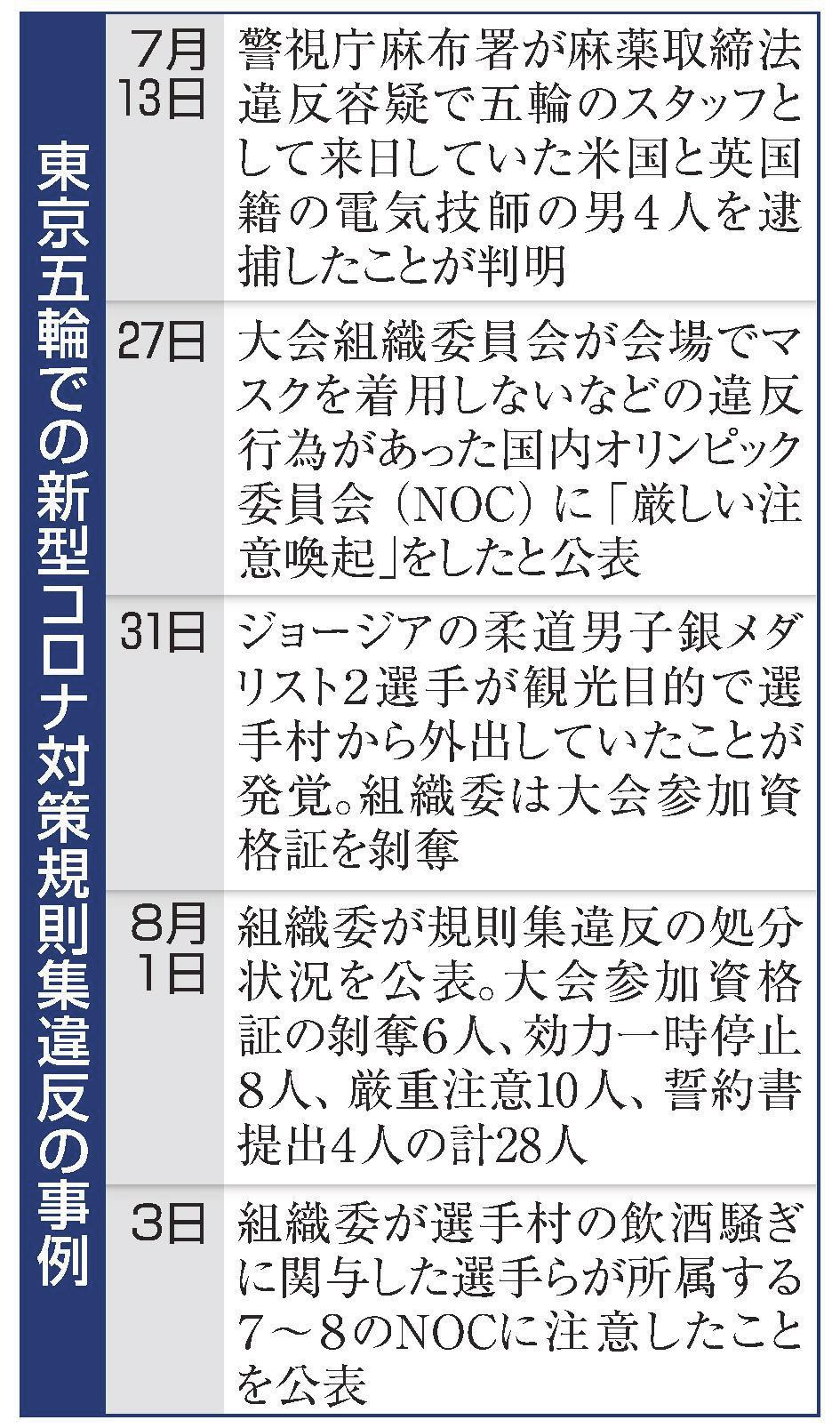 7月31日までに選手を含む大会関係者の処分に至ったケースは計28人。最も重い大会参加資格証のはく奪は、選手村を抜け出して東京タワーなど都内の観光地を訪れたとされるジョージアの柔道銀メダリストの2選手など計6人。効力一時停止が8人、厳重注意が10人、誓約書提出が4人いた。
