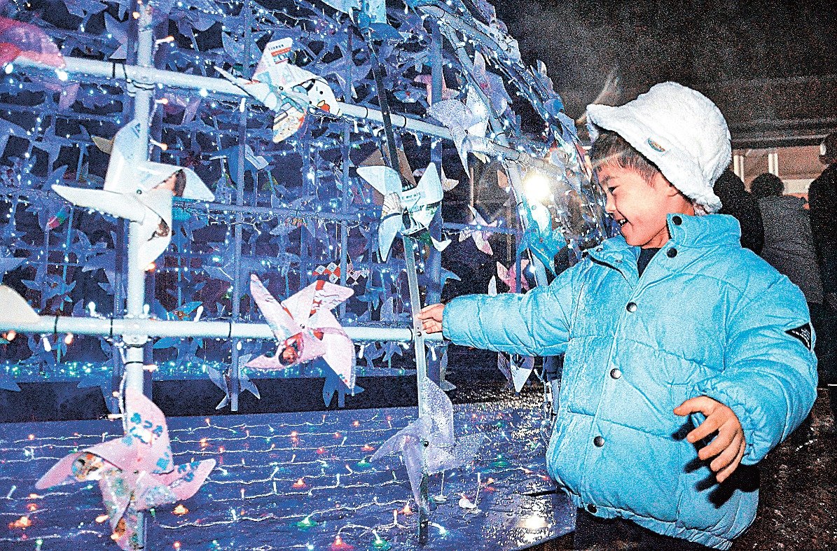 米子市皆生温泉4丁目の複合施設KAIKE(かいけ)テラスで22日夜、手作りの風車(かざぐるま)400個を取り付けたドーム型オブジェの点灯式があった。多彩な2千個の発光ダイオード(LED)が温泉街の一角を照らし、施設関係者、観光客ら約80人が新スポットの誕生を喜んだ。毎日午後5時から同10時まで点灯される。