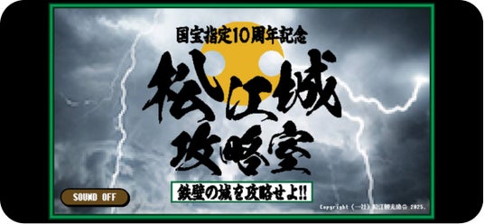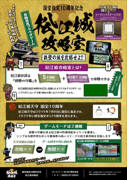 一般社団法人松江観光協会は、島根県松江市にある国宝松江城天守が2025年7月8日に「国宝指定10周年」を迎えることを記念し、松江城が誇る「鉄壁の守備」を全5ステージ+シークレットステージで体験できる高難易度オリジナルブラウザゲーム「松江城攻略室~鉄壁の城を攻略せよ!!~」を2月25日より公開しました。